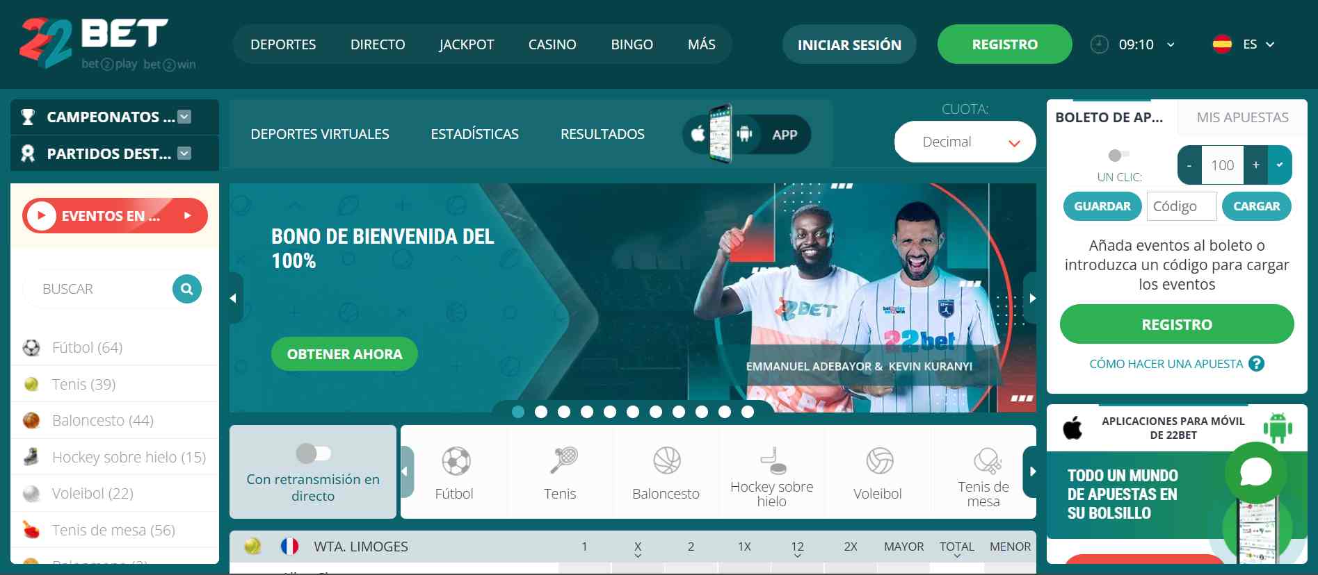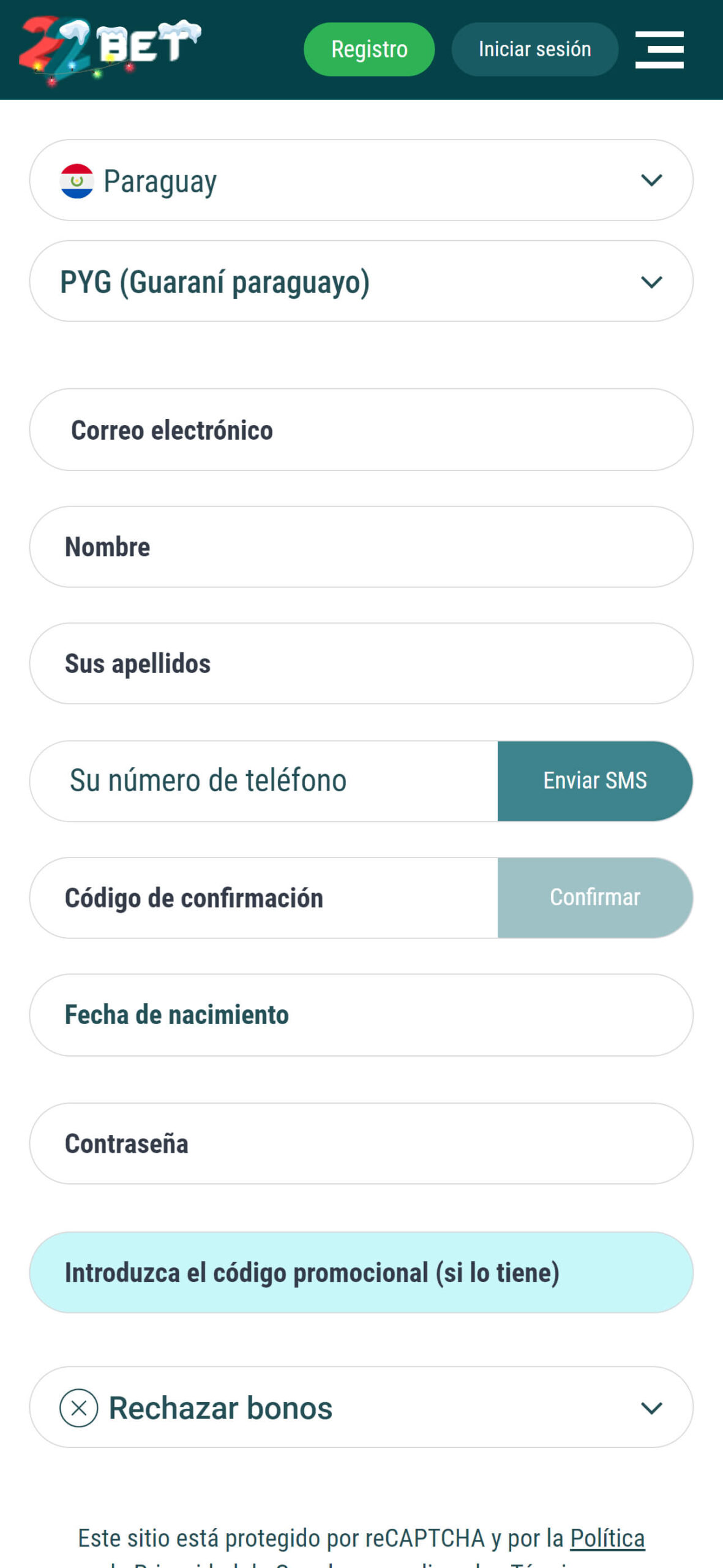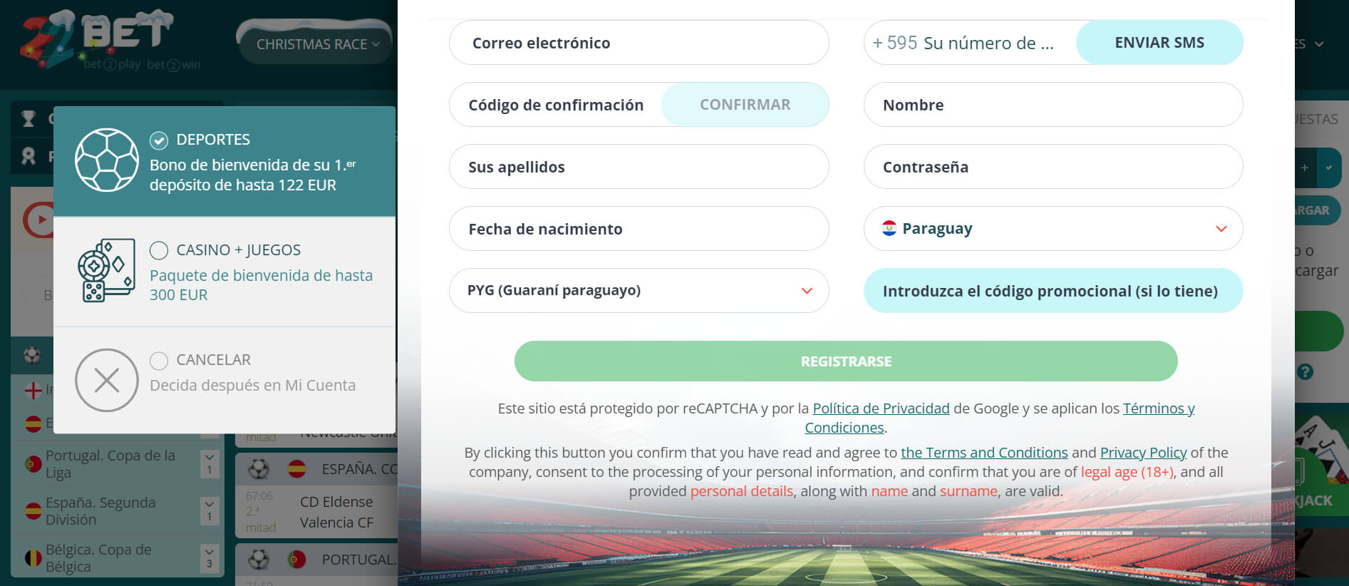 Inicia la aventura de apostar en 22Bet con un bono de bienvenida del 100% hasta 950000 PYG. Los pasos que debes seguir para la activación de este generoso bono son simples; crea una cuenta en 22Bet, solicita el bono y realiza un depósito mínimo de 8000 PYG.