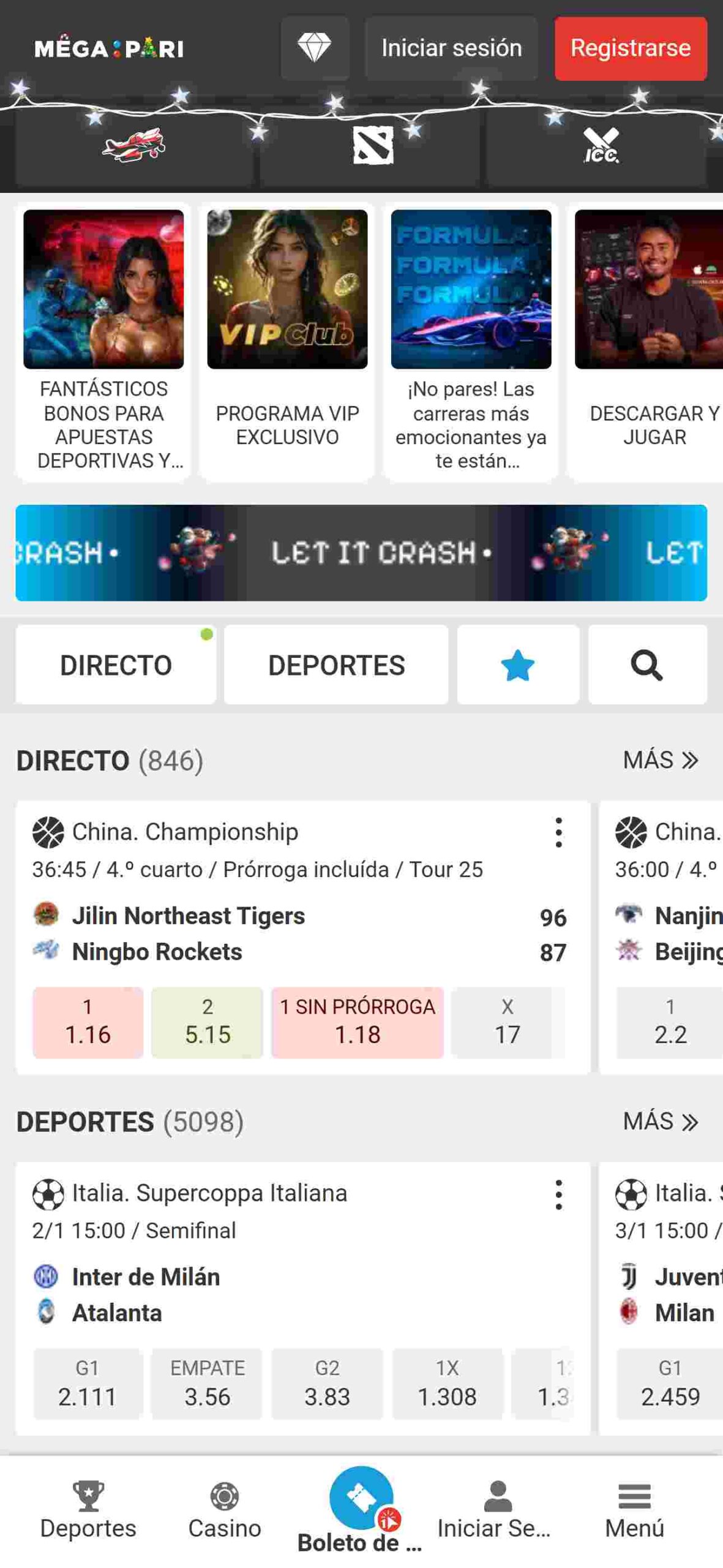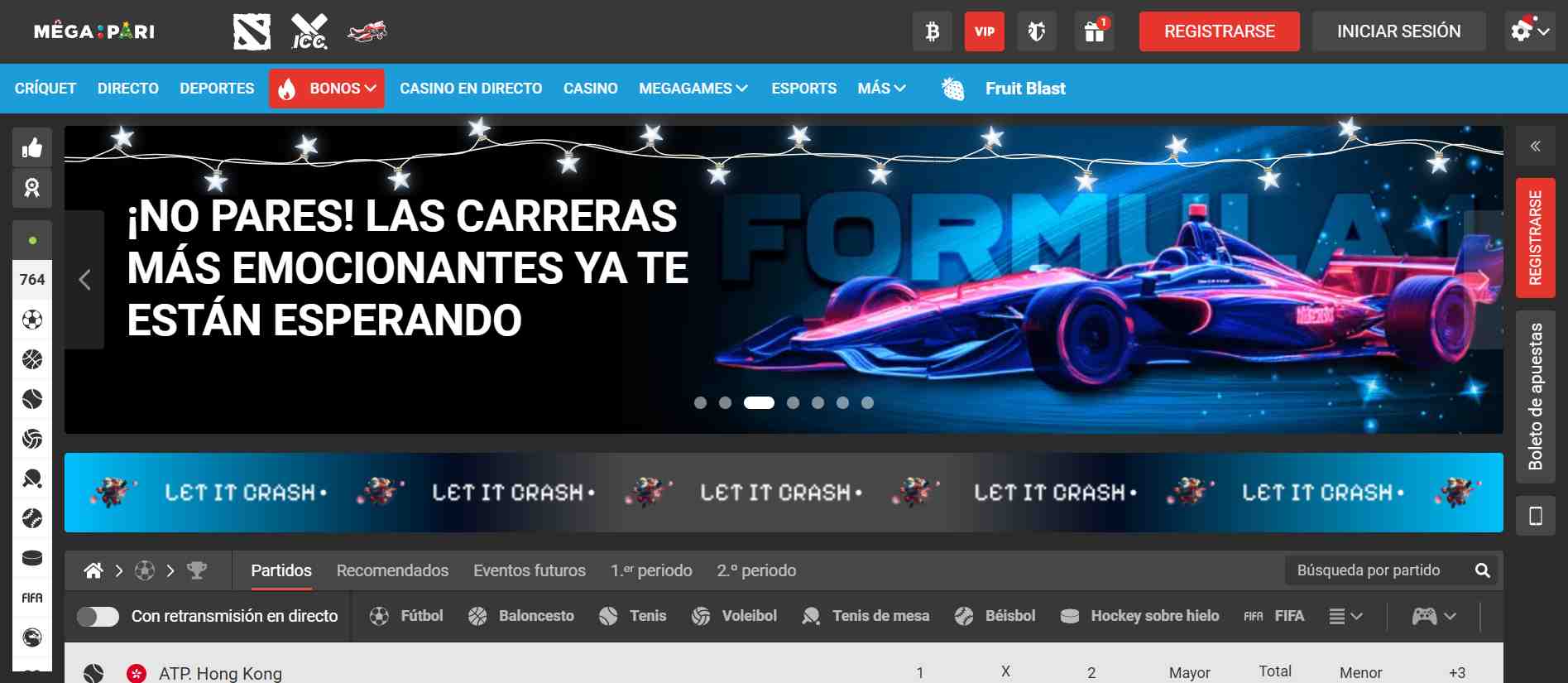 Para facilitar la navegación al usuario, Megapari cuenta cuenta con secciones y menús visibles en todo momento, al menos el menú superior, donde puedes hallar para hacer depósitos, configuraciones del sitio y las secciones más destacadas de Megapari. Si hablamos del menú ubicado en el lateral izquierdo de la pantalla, aquí puedes hallar recomendaciones de eventos, competiciones destacadas, toda la lista de deportes y filtros por tiempos, es decir, puedes reducir las opciones por eventos que pasen en la siguiente hora, diario o por periodos. En cuanto a la ubicación de boleto, este se encuentra en lado derecho del sitio y otros detalles como bonos, venta de boletos y apuestas en un clic, etc.