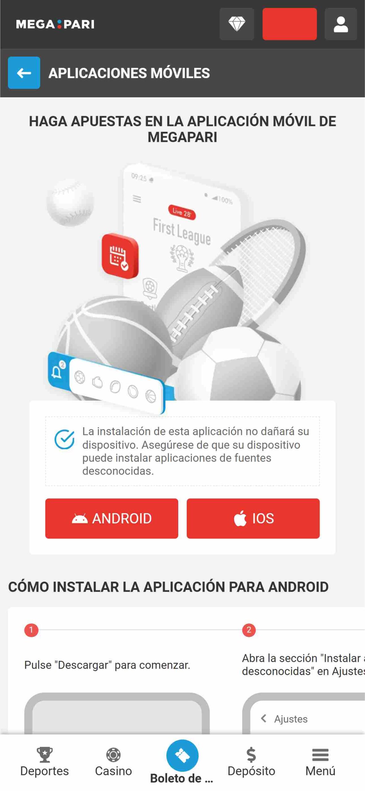 Una vez entras en Megapari, podrás fijarte que al final de página te ofrecen la opción “versión móvil”. Al presionar este botón, la pantalla se adapta a tu dispositivo sin problemas y sin eliminar ninguna de las funciones. Ahora, para mayor comodidad, puedes descargar la aplicación siguiendo estos pasos: